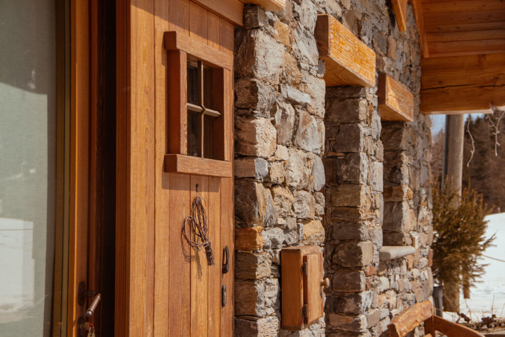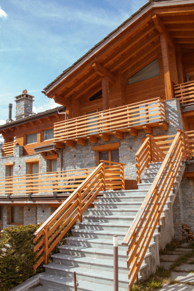 Abbiamo voluto rendere l’architettura alpina più moderna realizzando dei corpi a sbalzo e dei volumi sfalsati sui piani, pur mantenendo i materiali tradizionali quali la pietra e il legno,