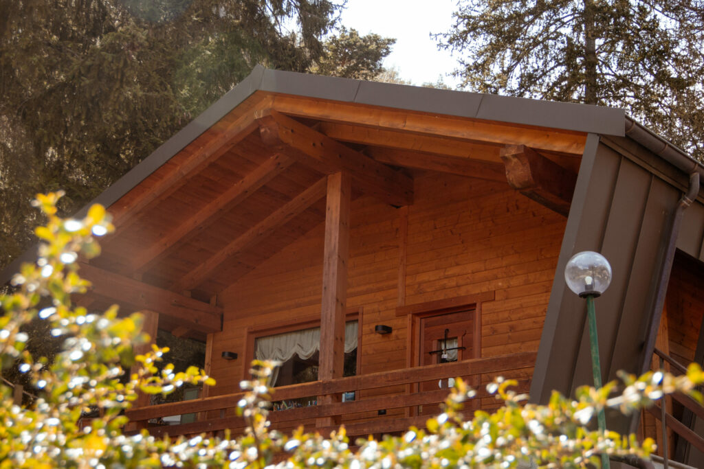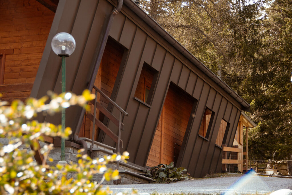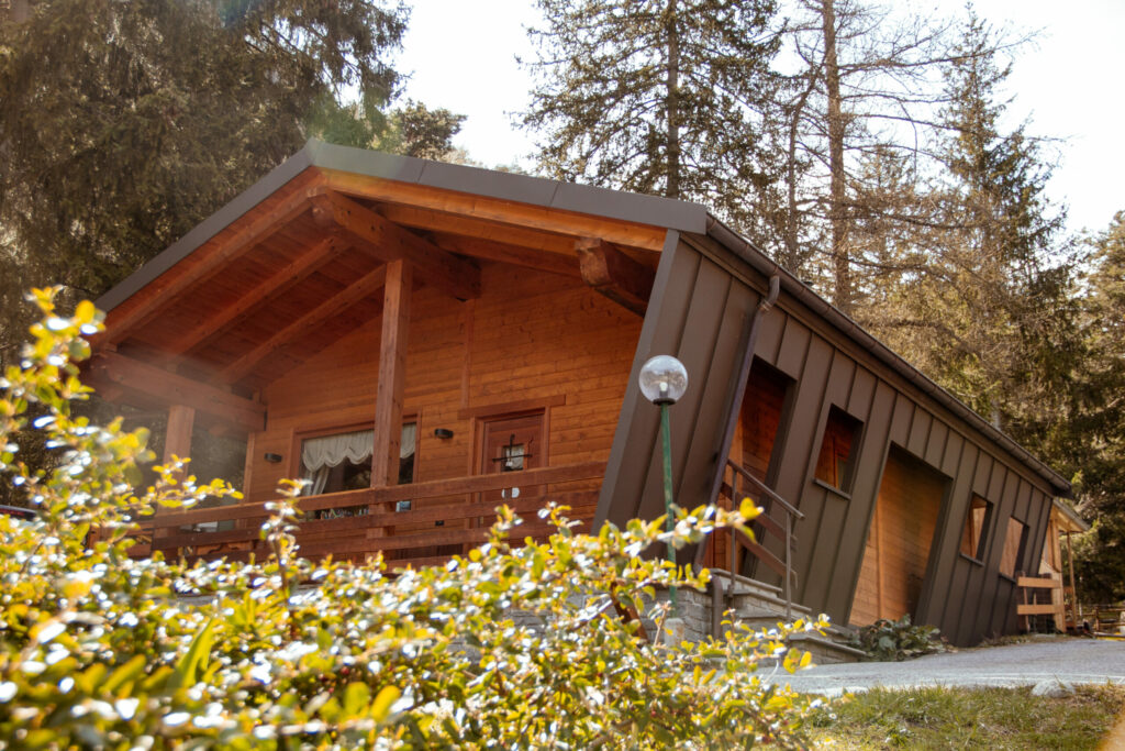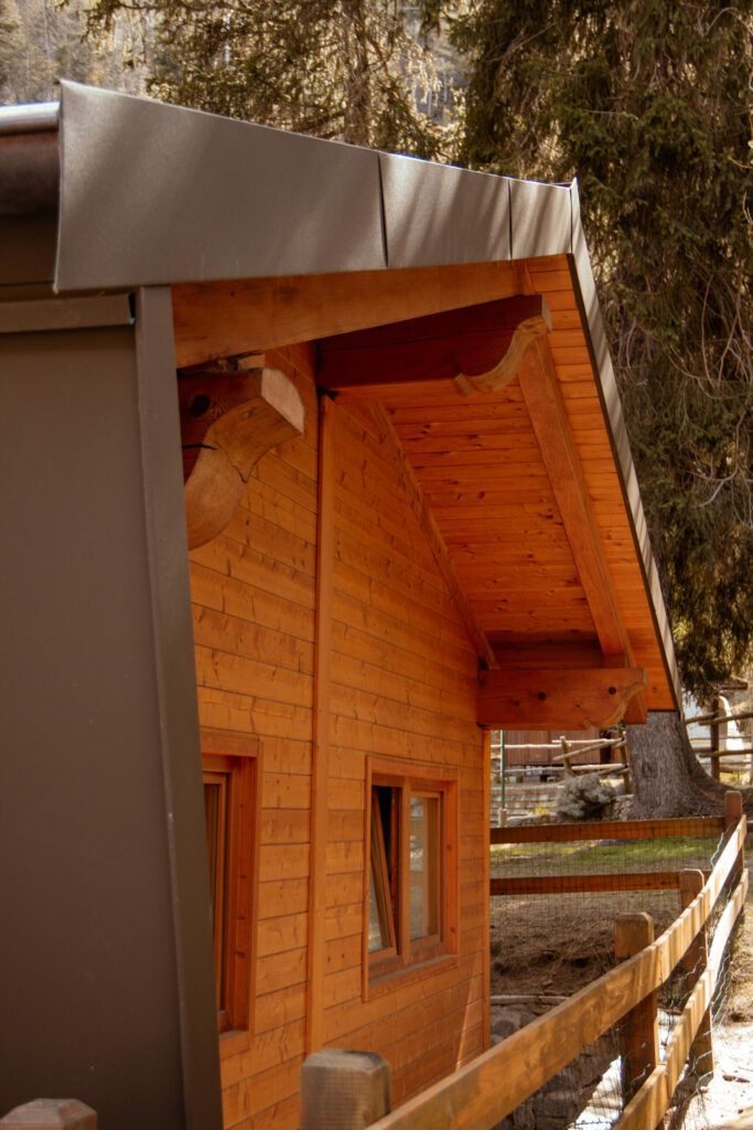 Abbiamo quindi pensato ad una copertura in lamiera che diventa anche parete per contenere e proteggere lo chalet in legno.